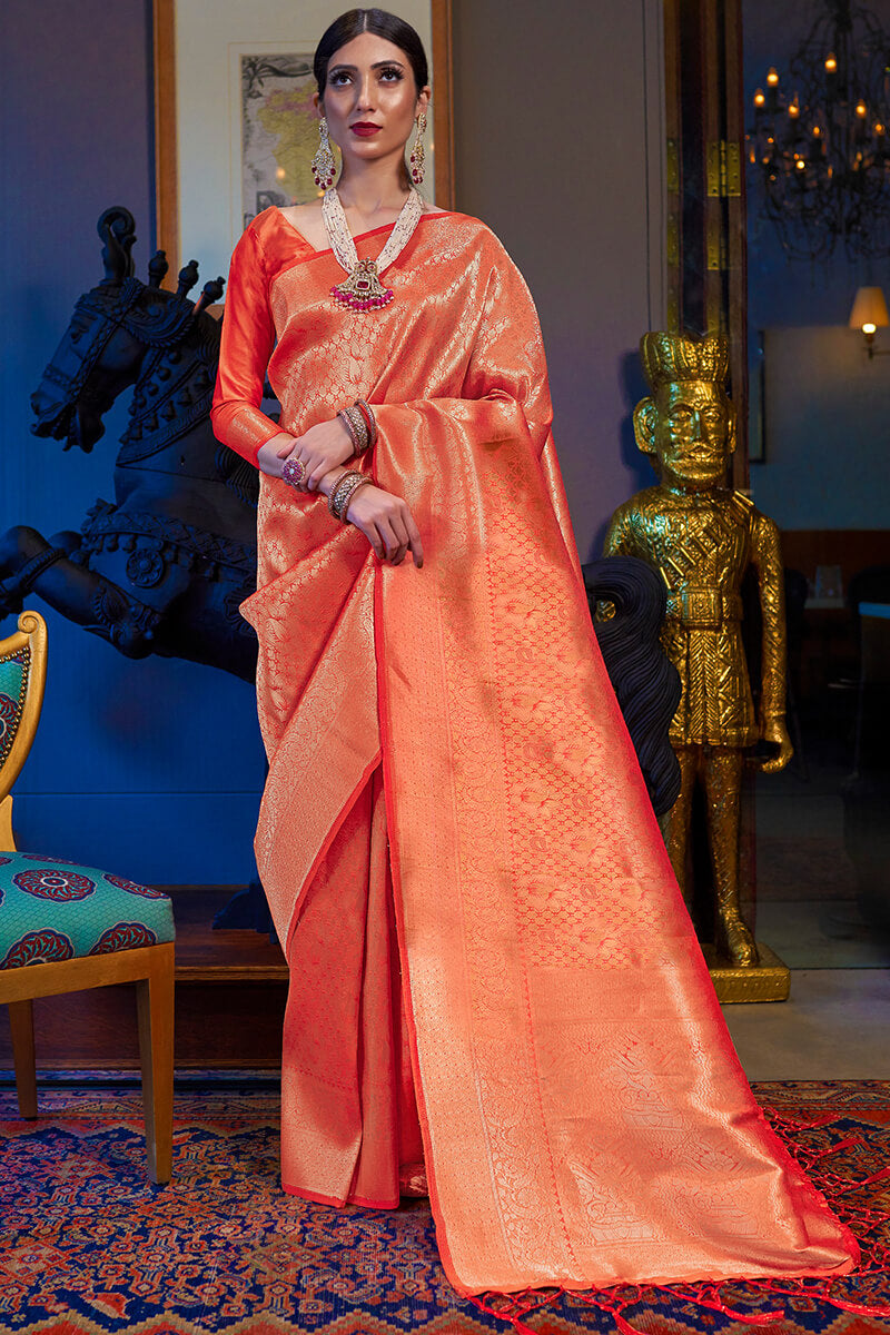 Amazing Orange Kanjivaram Silk Saree With Girlish Blouse Piece