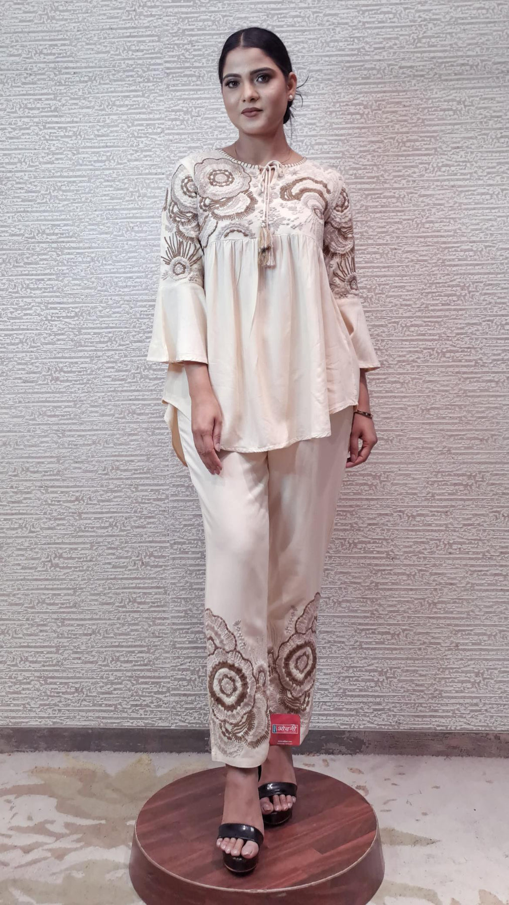 The asymmetric silhouette adds a modern twist to your look while the floral applique work adds a touch of femininity and charm. Whether you're attending a brunch with friends or a cocktail party, this co-ord set is sure to make you stand out with its effortless style and eye-catching details. Pair it with your favorite accessories for a complete look that exudes confidence and sophistication.