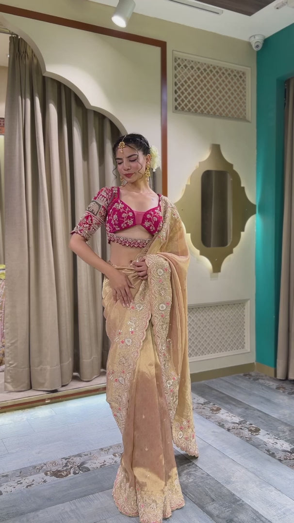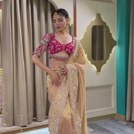 This golden saree embellished with sequins & dabka work is the best choice to rule the whole party.