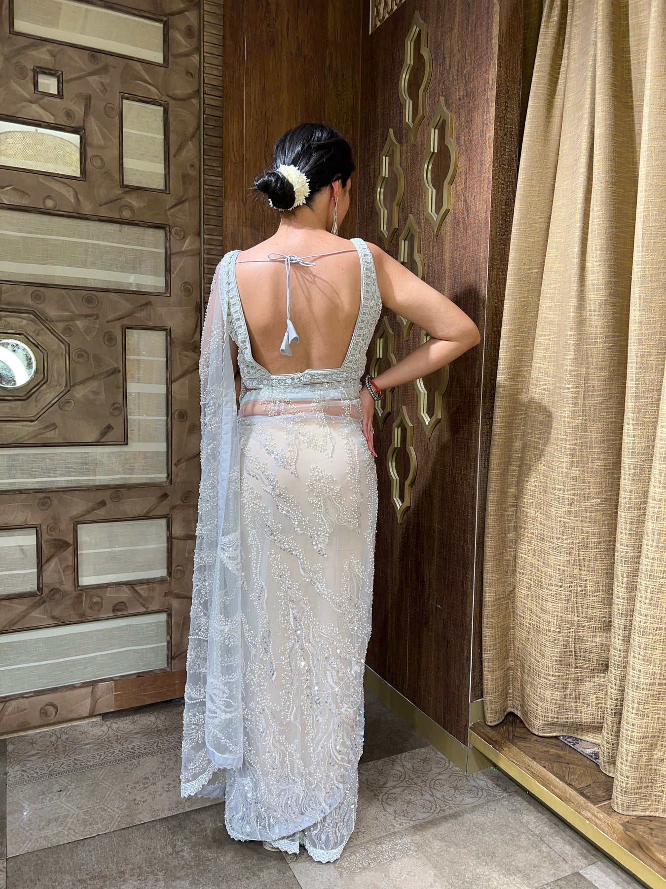 Be the fashionista wearing blue color floral motif net saree embellished with beads, sequins and zari with matching sleeveless blouse