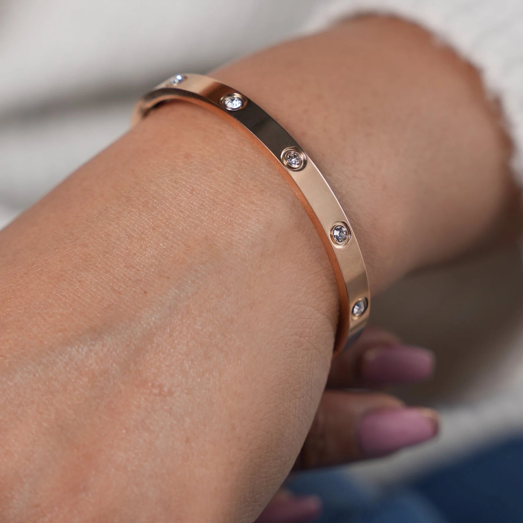 A sophisticated set of sleek bangle-style bracelets available in gold, rose gold, and silver finishes. Embellished with evenly spaced shimmering crystals, these bracelets radiate understated elegance. Their polished metal surface adds a touch of luxury, while the slip-on design ensures effortless wear and a comfortable fit. Pair these versatile bangles with a formal gown for a glamorous evening look, or wear them with a chic office ensemble to add a refined touch. Mix and match the three tones for a trendy stacked effect or wear them individually for minimalist charm. Perfect for weddings, parties, or corporate events, these bracelets effortlessly elevate your outfit. They also make a thoughtful gift for anniversaries, birthdays, or festive celebrations, offering timeless style for any special moment.