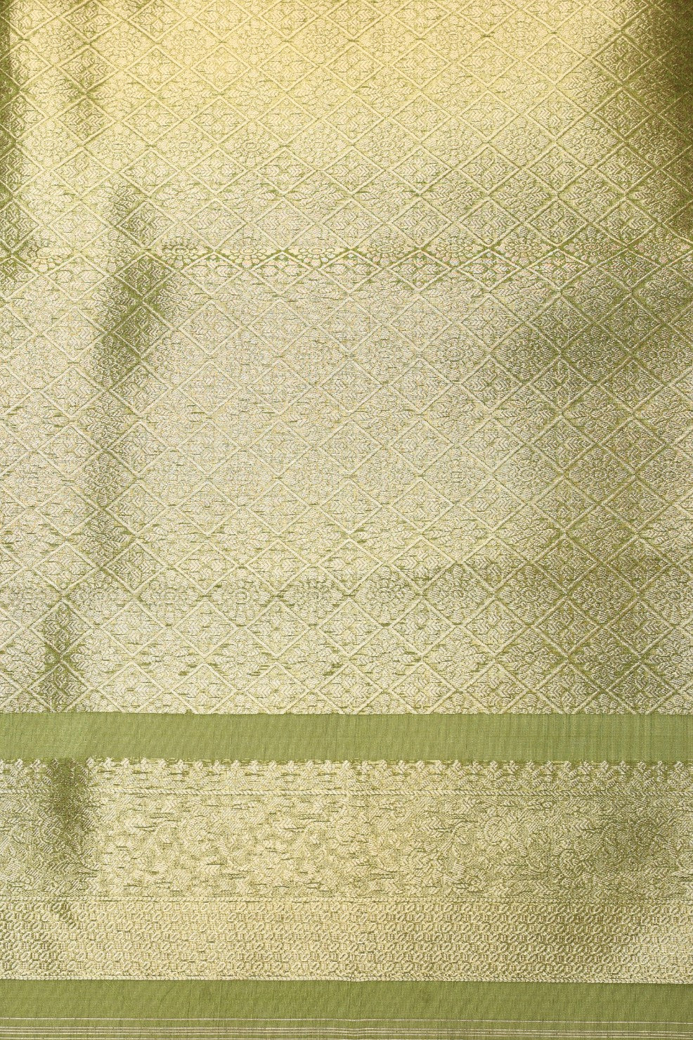 Walk in grace wearing green color floral motif woven saree having broad zari border paired with matching blouse having elbow length sleeves