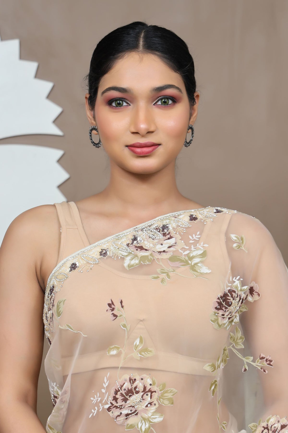 Make the heads turn wearing this beautiful cream color floral motif embroidered saree embellished with sequins, cut dana paired with matching blouse having full sleeves..