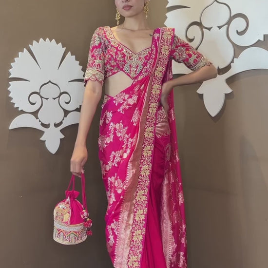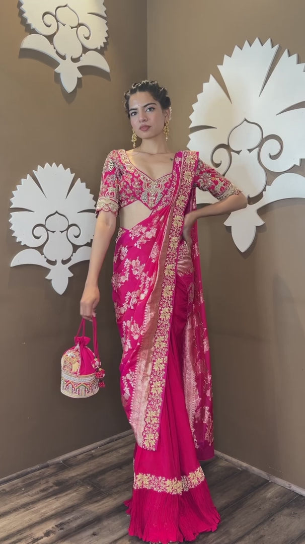 This magenta saree specially handcrafted in silk fabric with the embellishment of zardozi, dabka and stone work with same colour blouse.