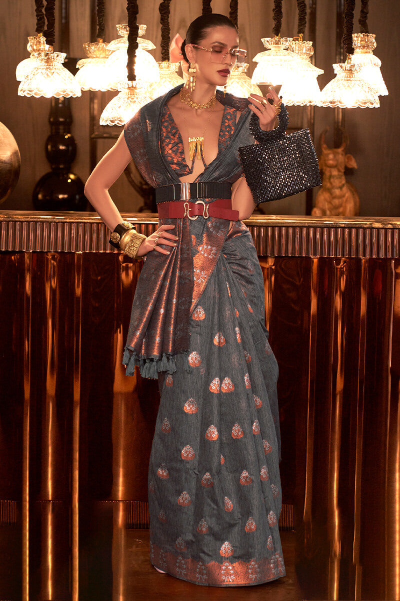 Elegant Grey Cotton Silk Saree With Gleaming Blouse Piece