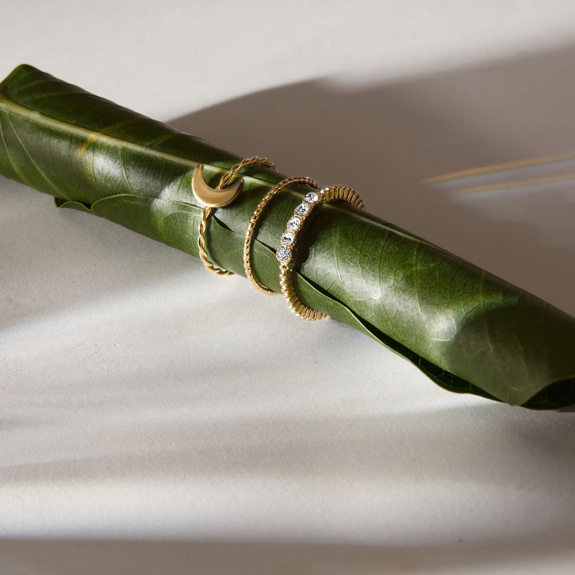Dipped in a glistening golden tone, these rings are designed with twisted forms, diamante accents and celestial motifs.
