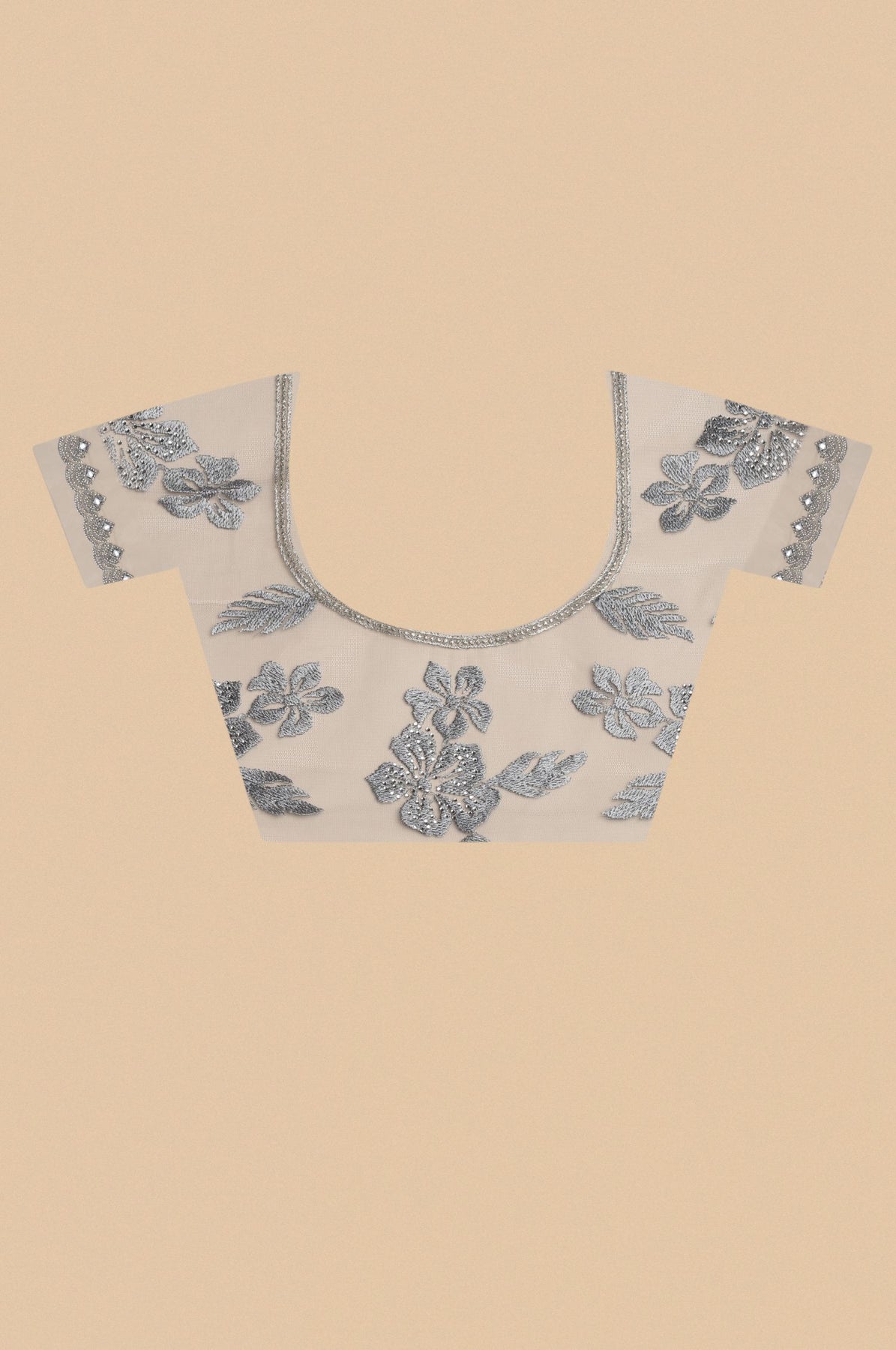 Graceful Grey Net Saree with Intricate Thread Work and Sparkling Sequins