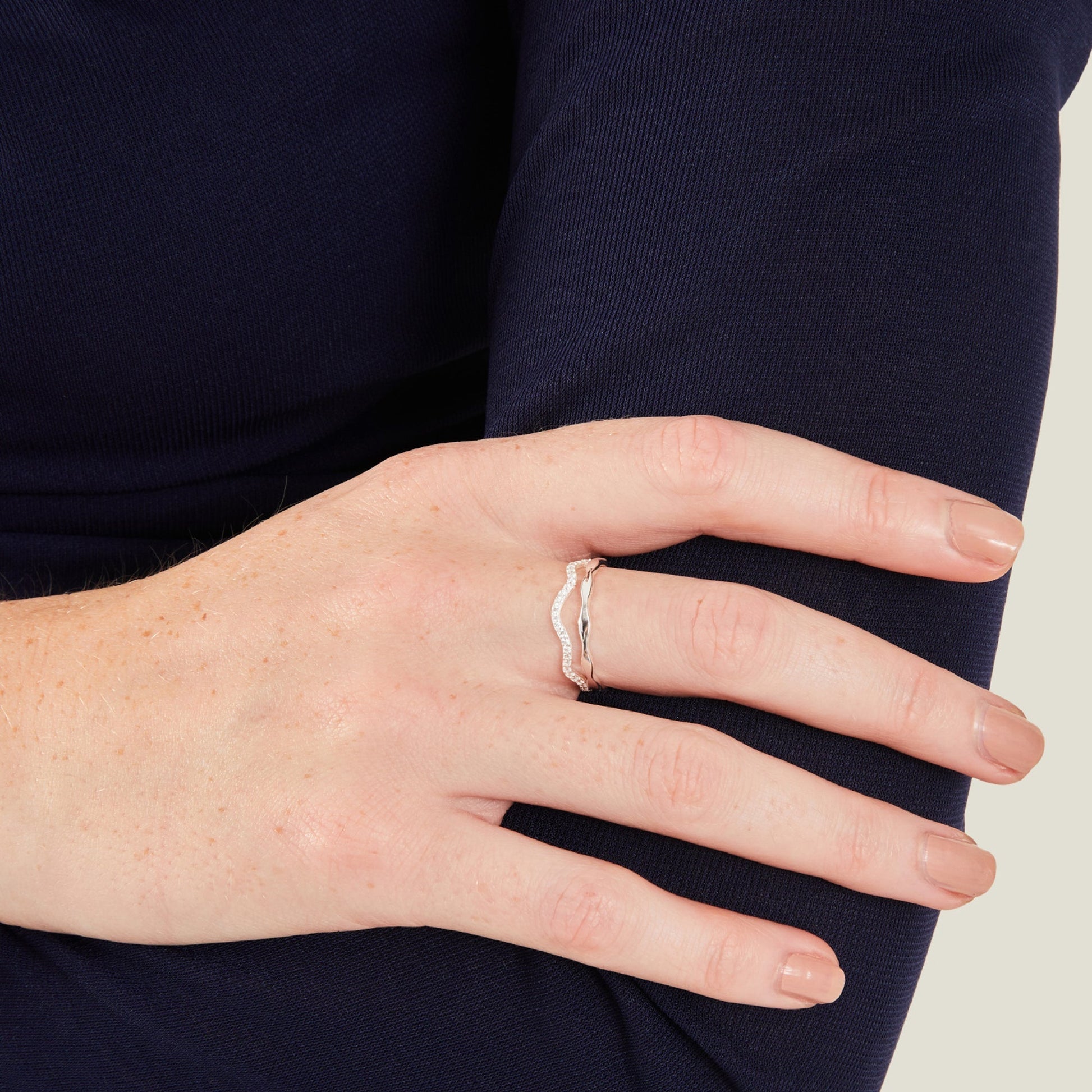 Give us a wiggle! Crafted in sterling silver, this double-layer ring is perfect for a simple stack. It's designed in a wiggly profile, with a diamanté encrusted layer.