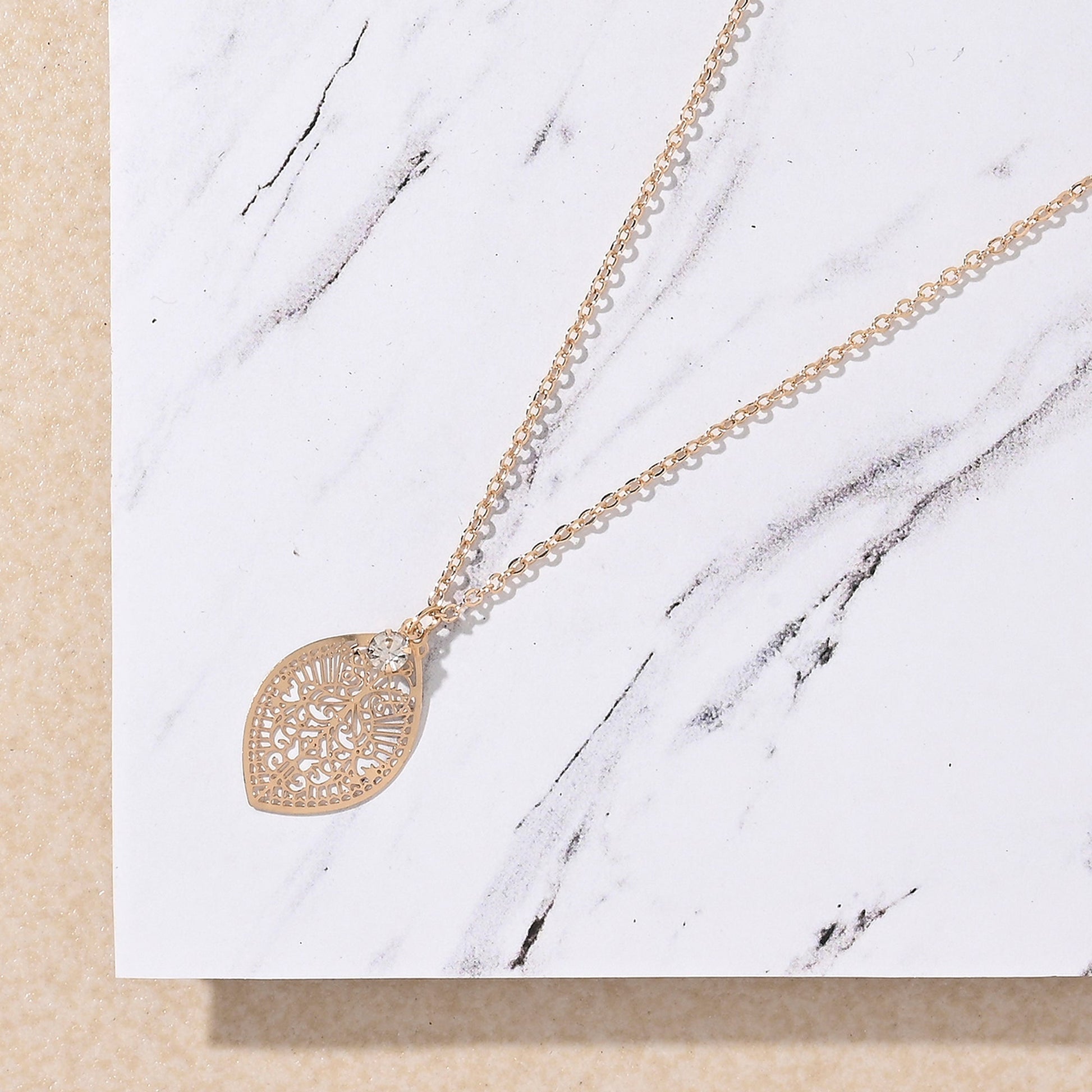 An intricate filigree design fills this necklace with boho styling. It's crafted in gold-tone metal, with a filigree leaf pendant that hangs on a fine chain necklace and a tiny diamante for a bit of sparkle. Fastens with a lobster clasp and extender.