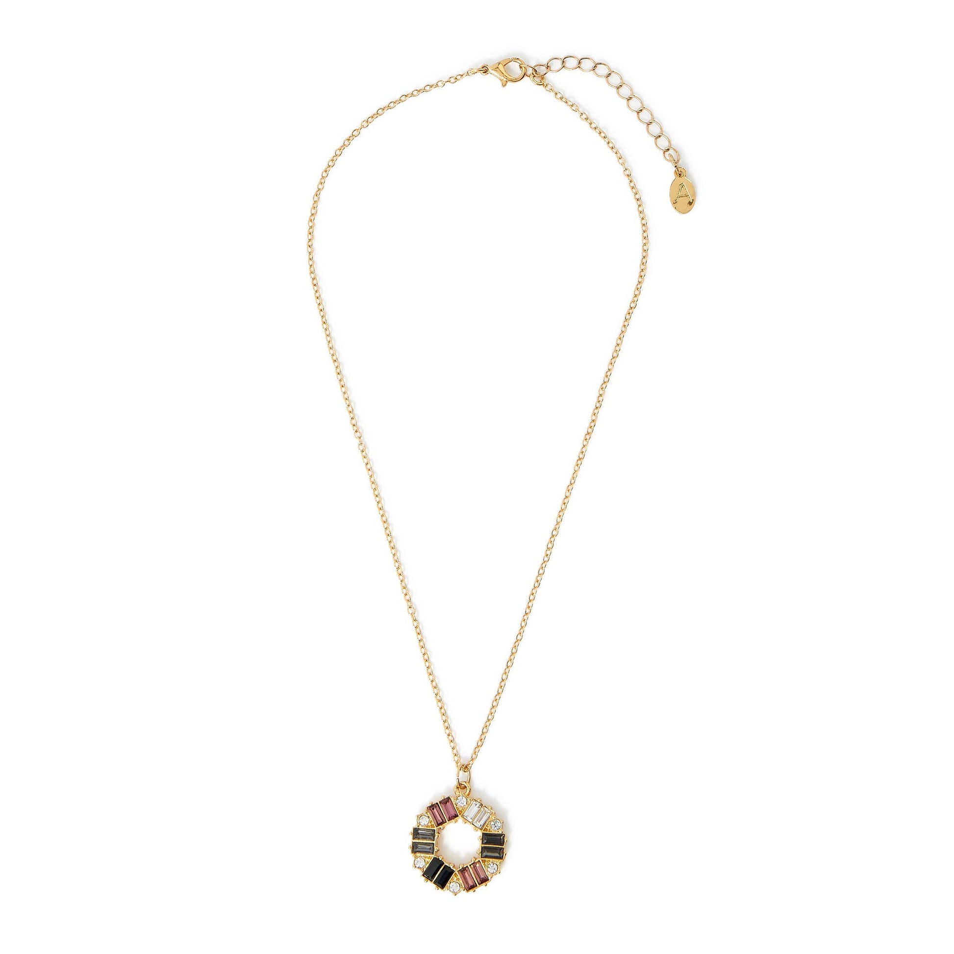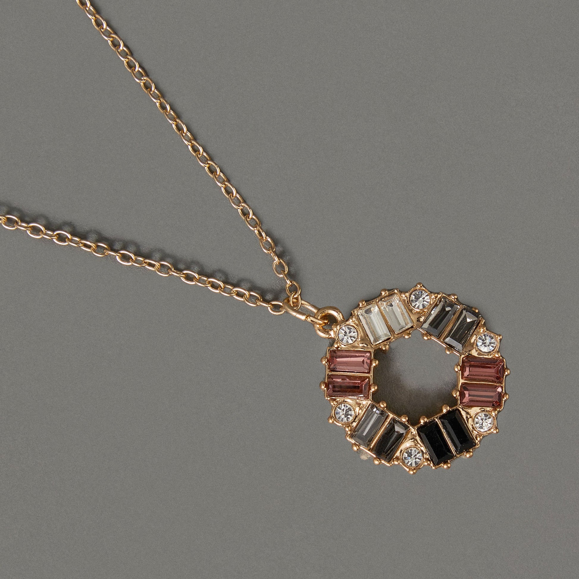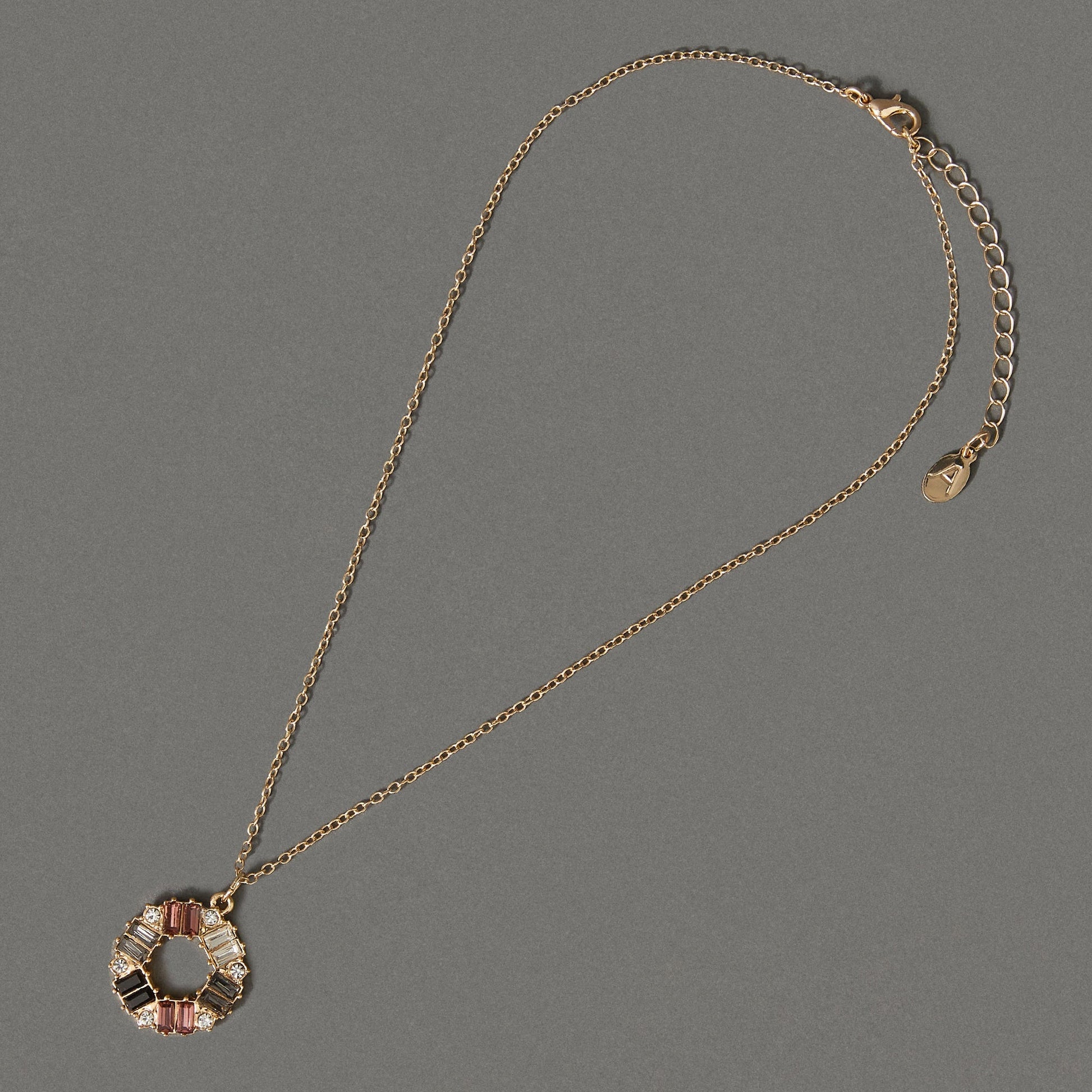 A wreath of sparkles hangs beautifully on a fine chain with this piece, crafted in gold-tone metal. It features deep-tone rectangle gems, with sparkling diamantes sat in between.