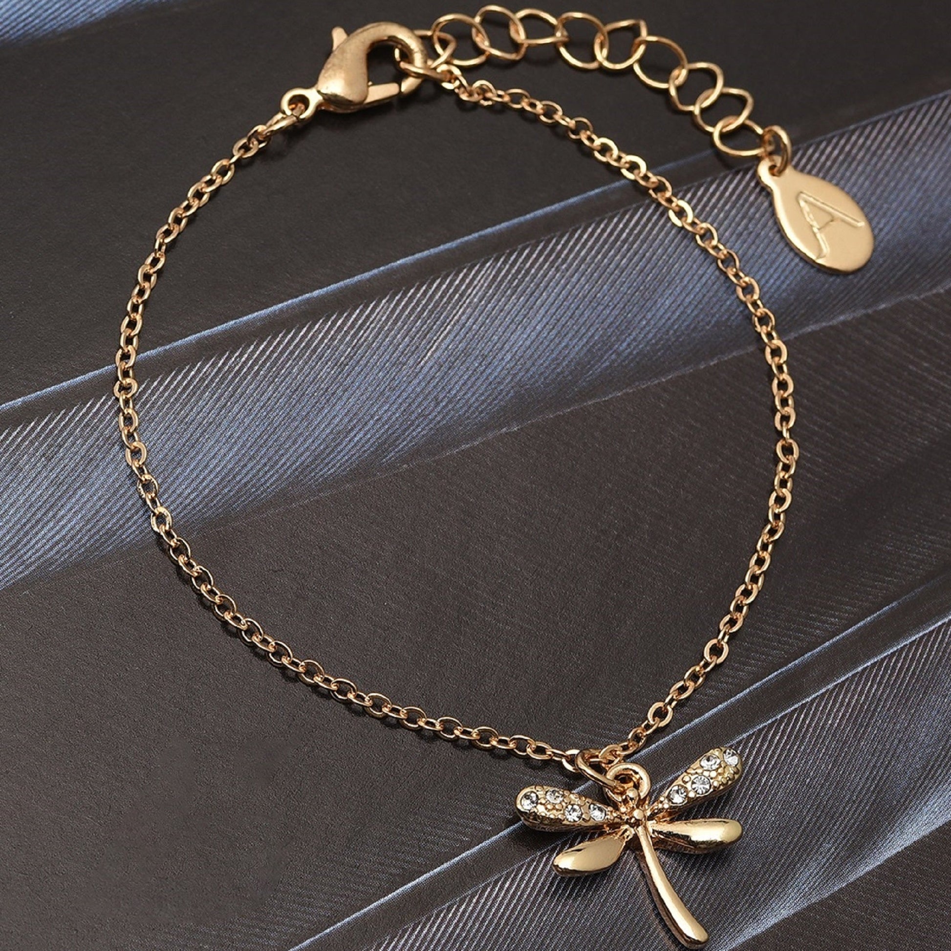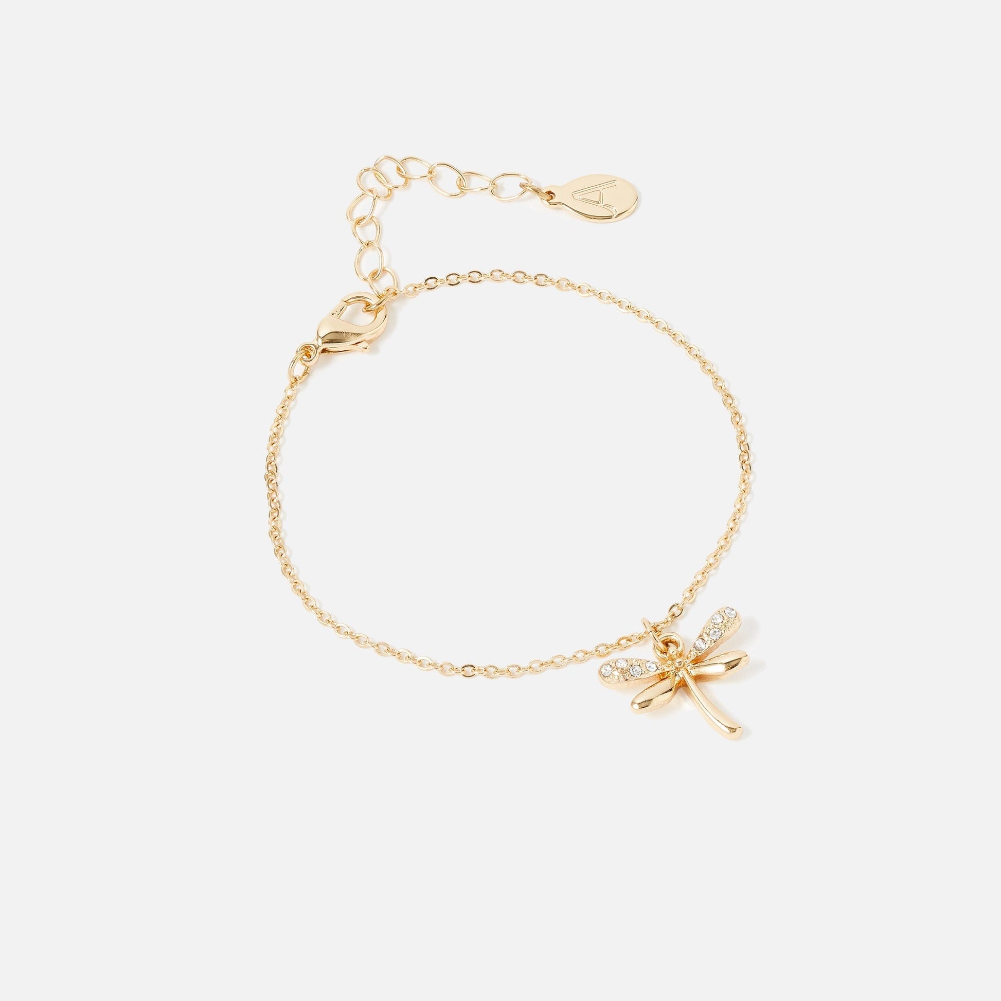 This dainty dragonfly will accompany any look, decorating your wrist delicately. The chain features a beaded design with a diamante paved dragonfly charm, all designed in gold-tone metal. Fastens with a lobster clasp and extender. Great as a gift!