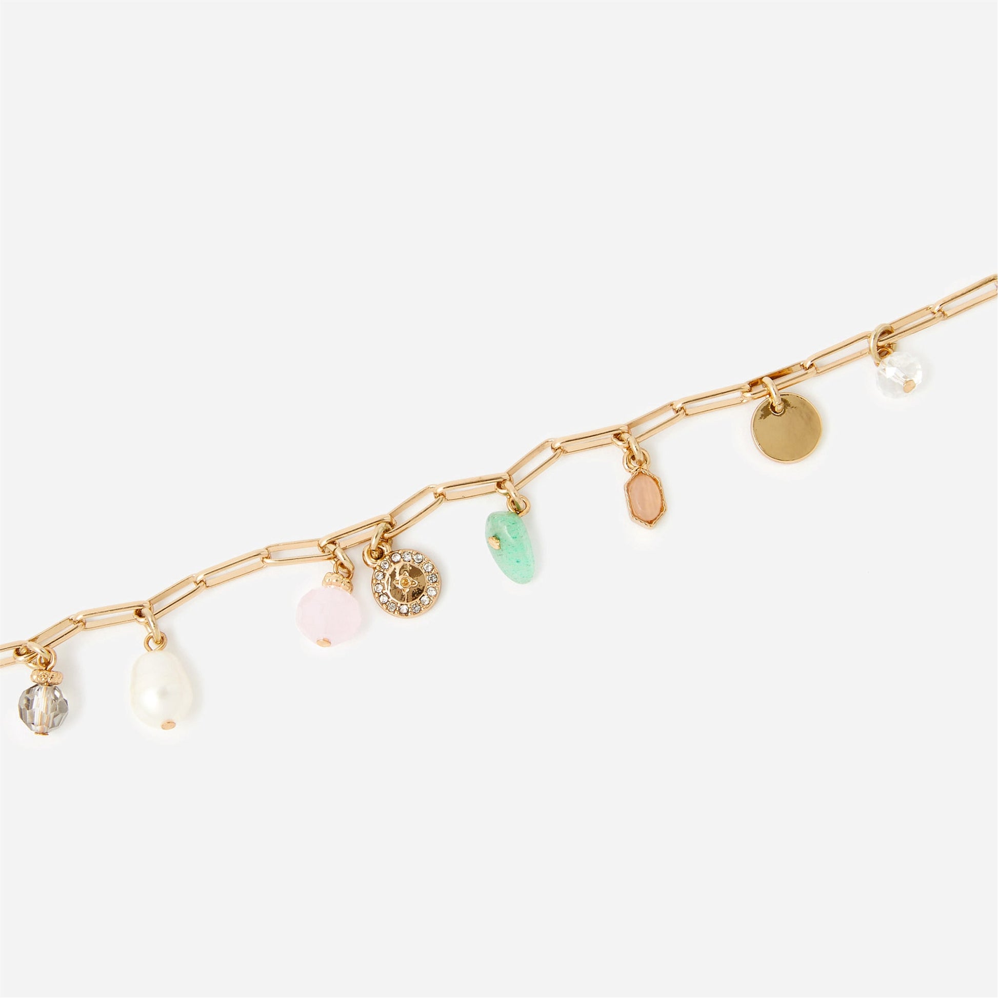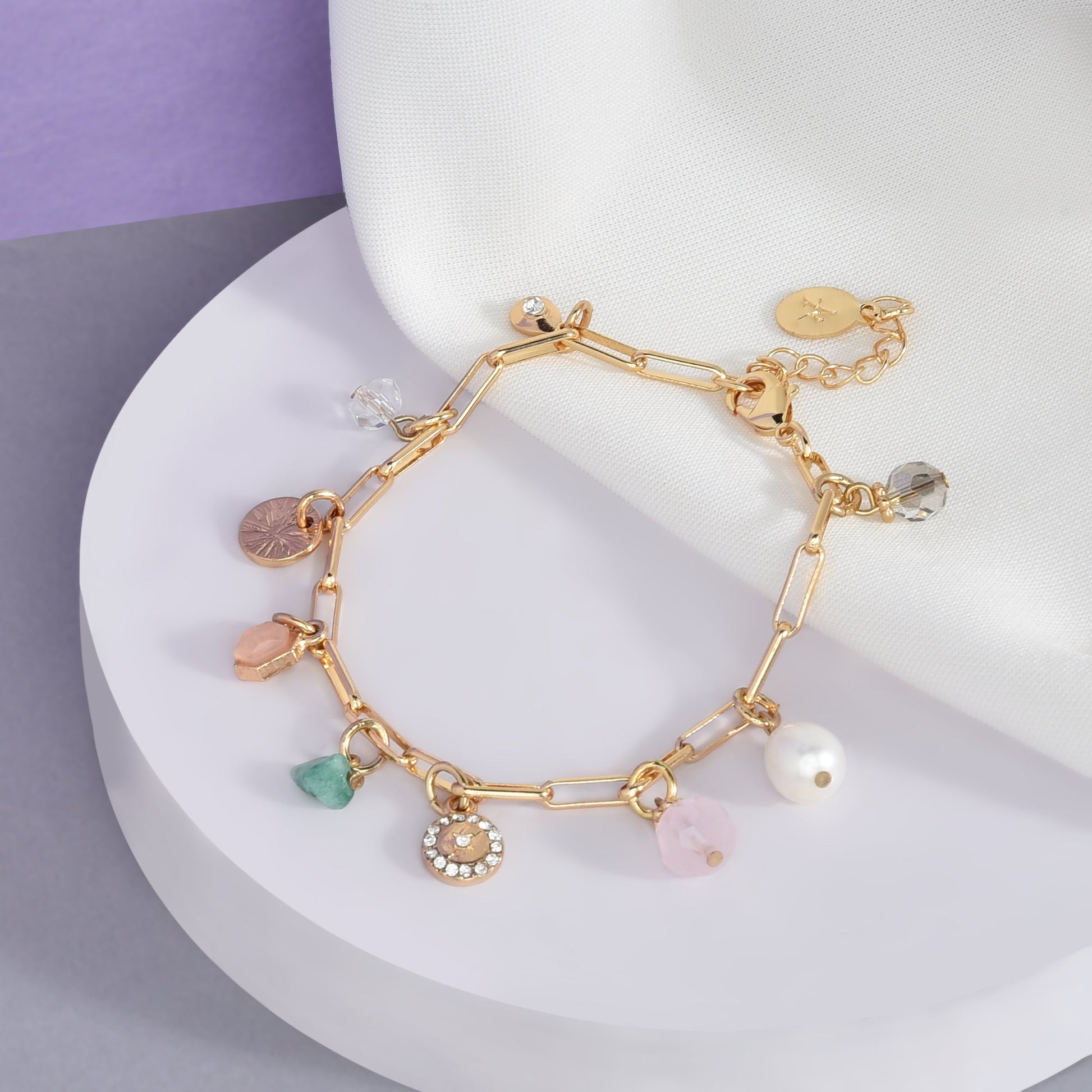 Complete with pearly features and faux-gemstones, this chic charm bracelet is the perfect piece to accessorise your wrist. Designed in gold-tone metal and fastens with a lobster clasp and extender.