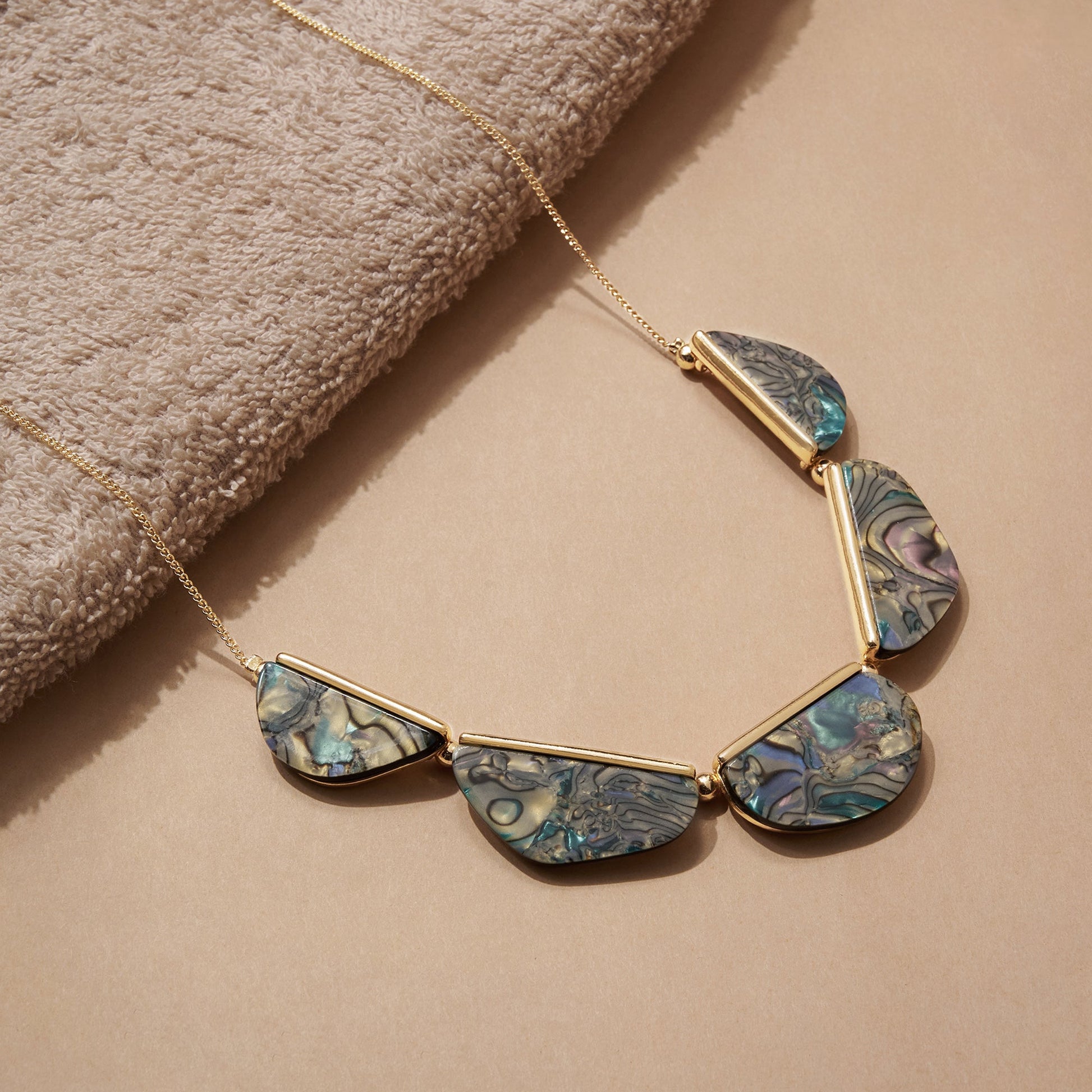 Pretty and pearlised, this gold-tone necklace is designed with a collection of semi-circle charms. Each charm is embellished with Mother of Pearl, fastening with an adjustable lobster clasp.