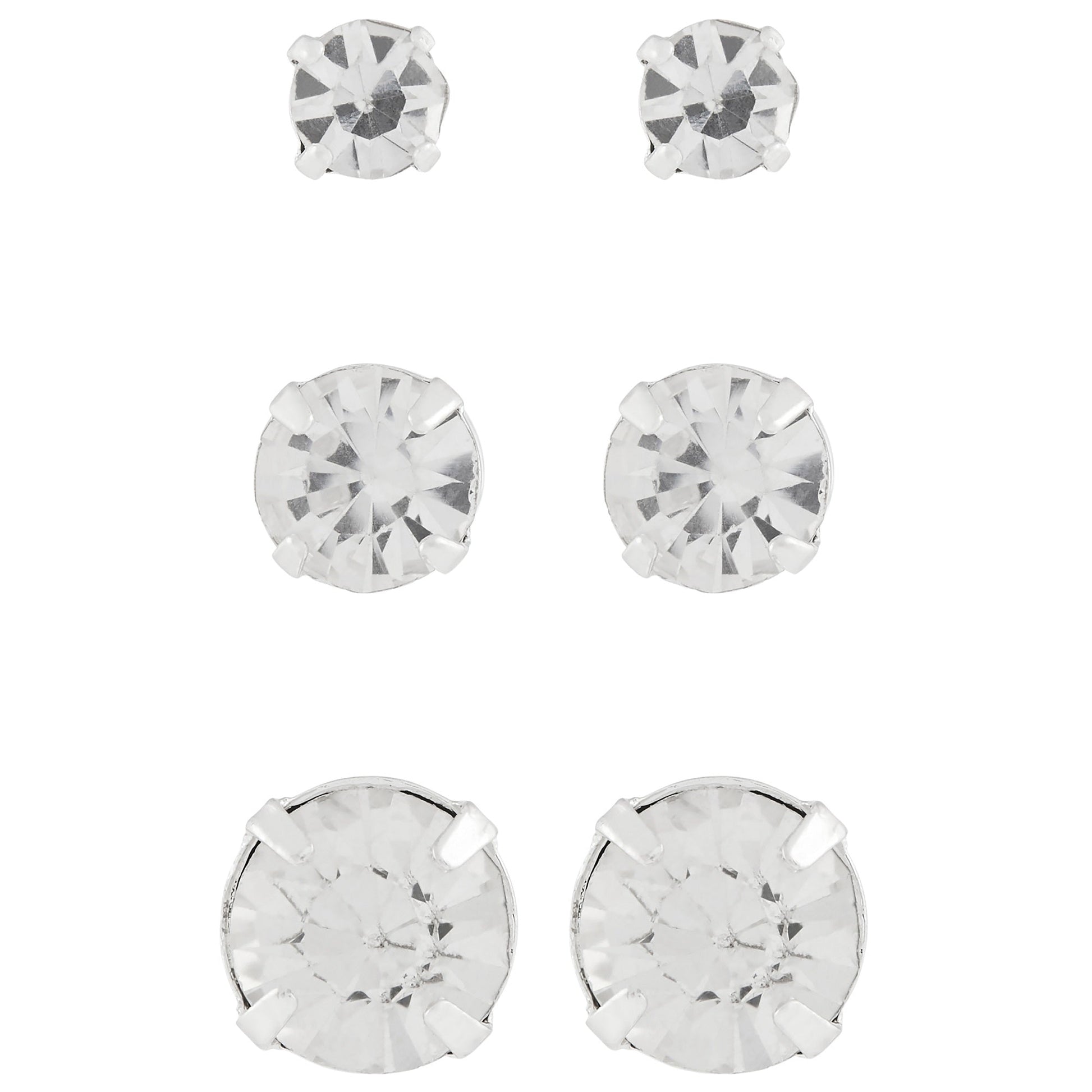 These sparkly studs feature a circle-shaped crystal set on silver-tone metal. Three pairs included.