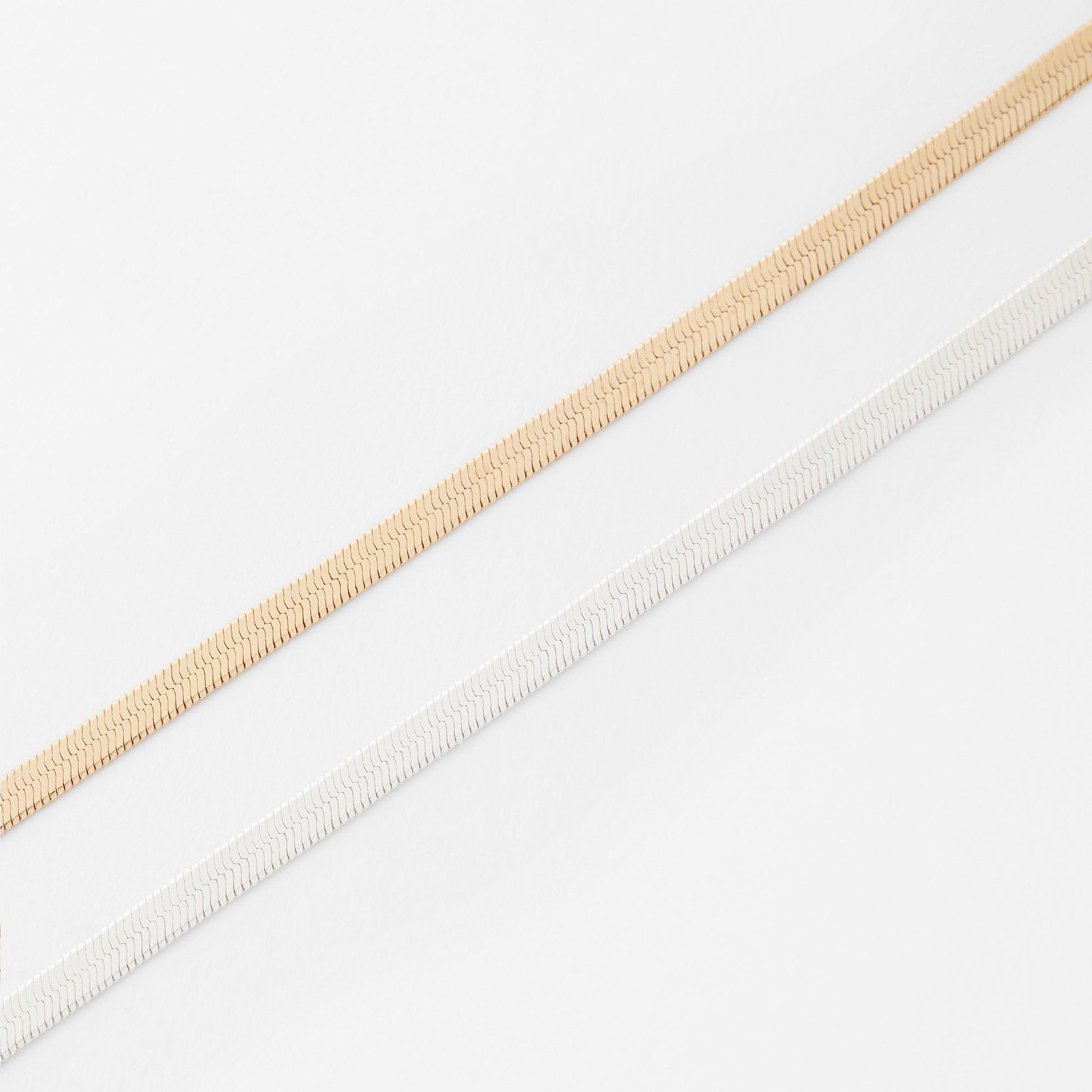 Designed to work from desk to date, these snake chains will sit flat to your chest beautifully. Pair with the matching bracelet and under an open collar shirt for a subtle statement. Fastens with a lobster clasp and extender.