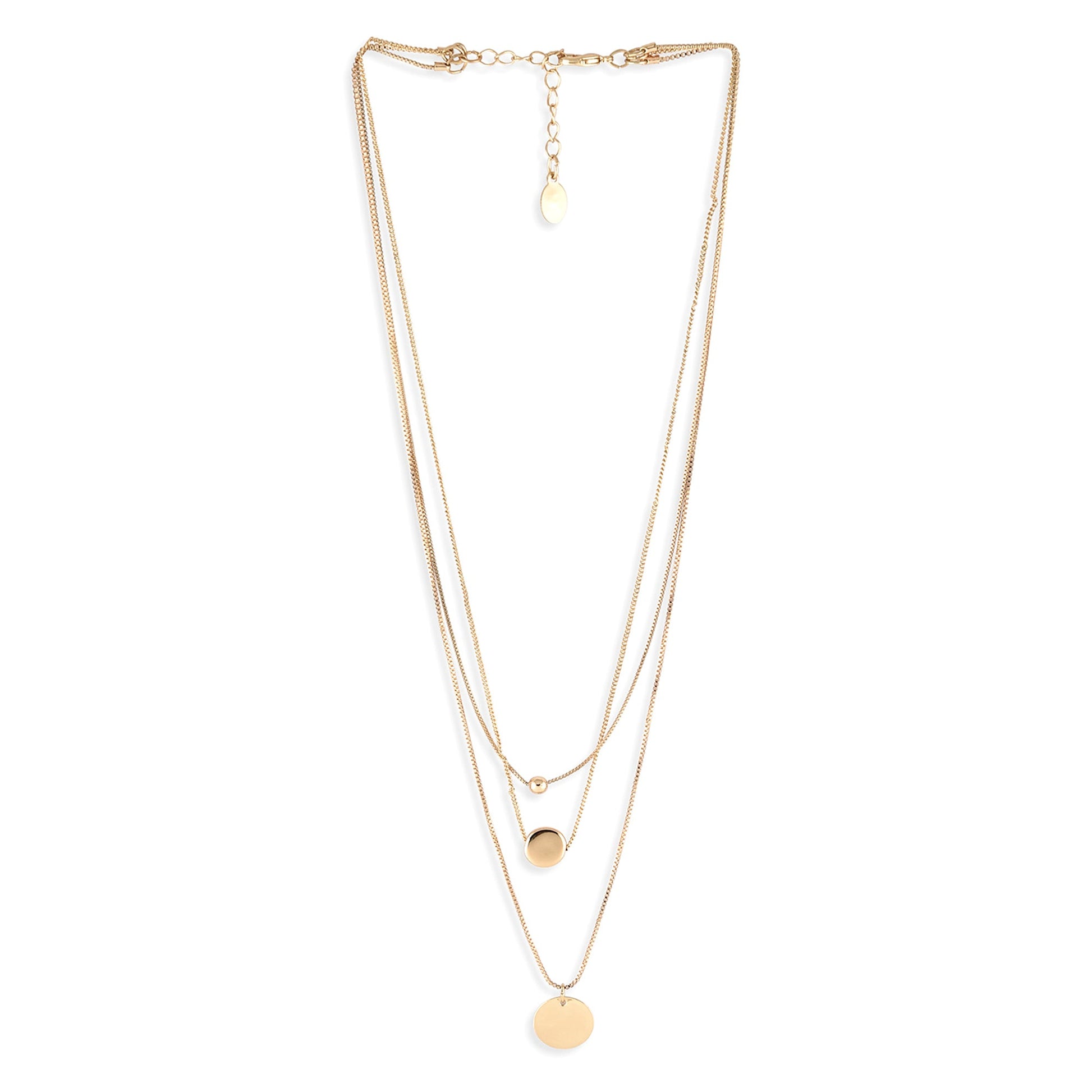 Keep things simple with this layered, gold-tone necklace, featuring three slim chains and circle-shaped pendants. Fastens with a lobster clasp and extender.