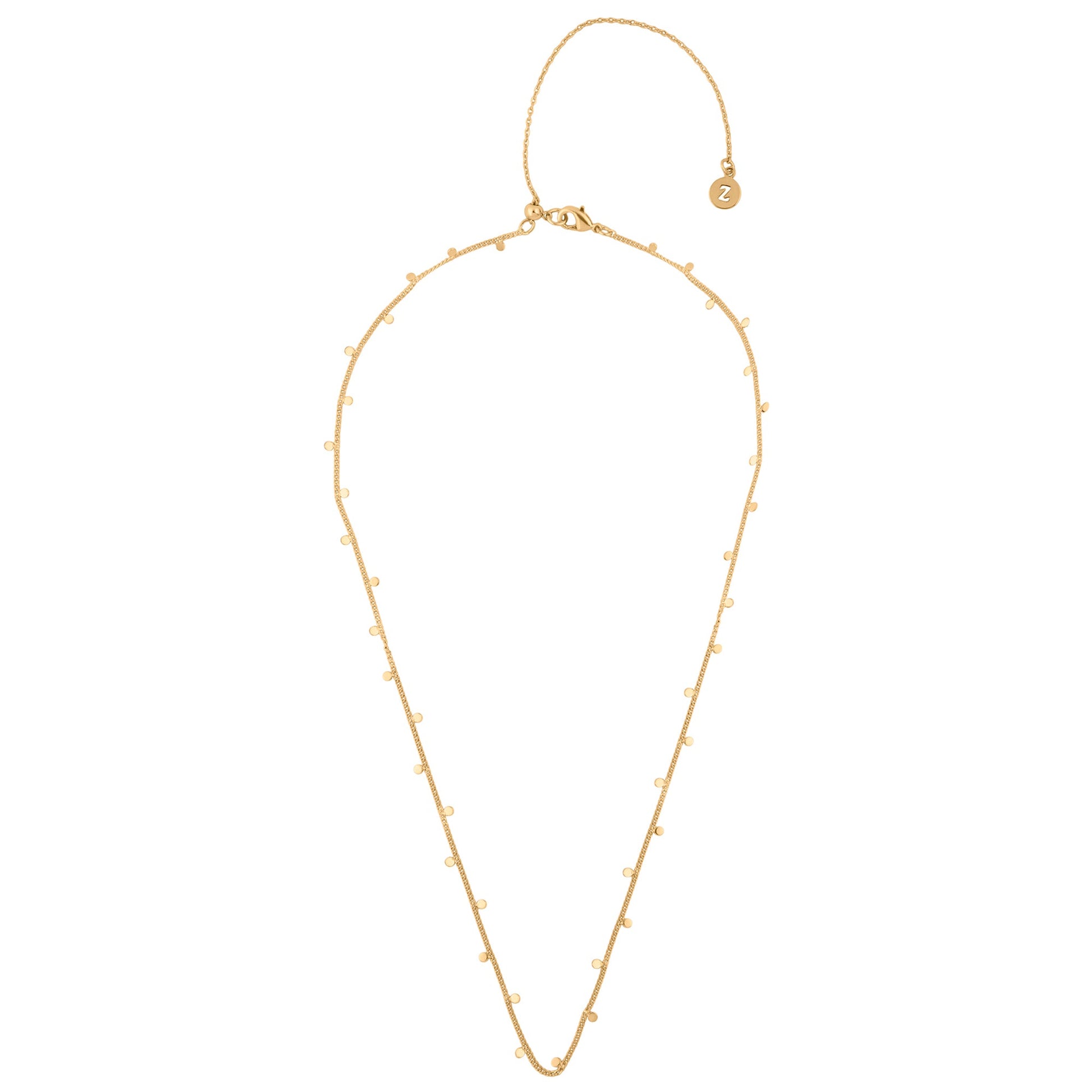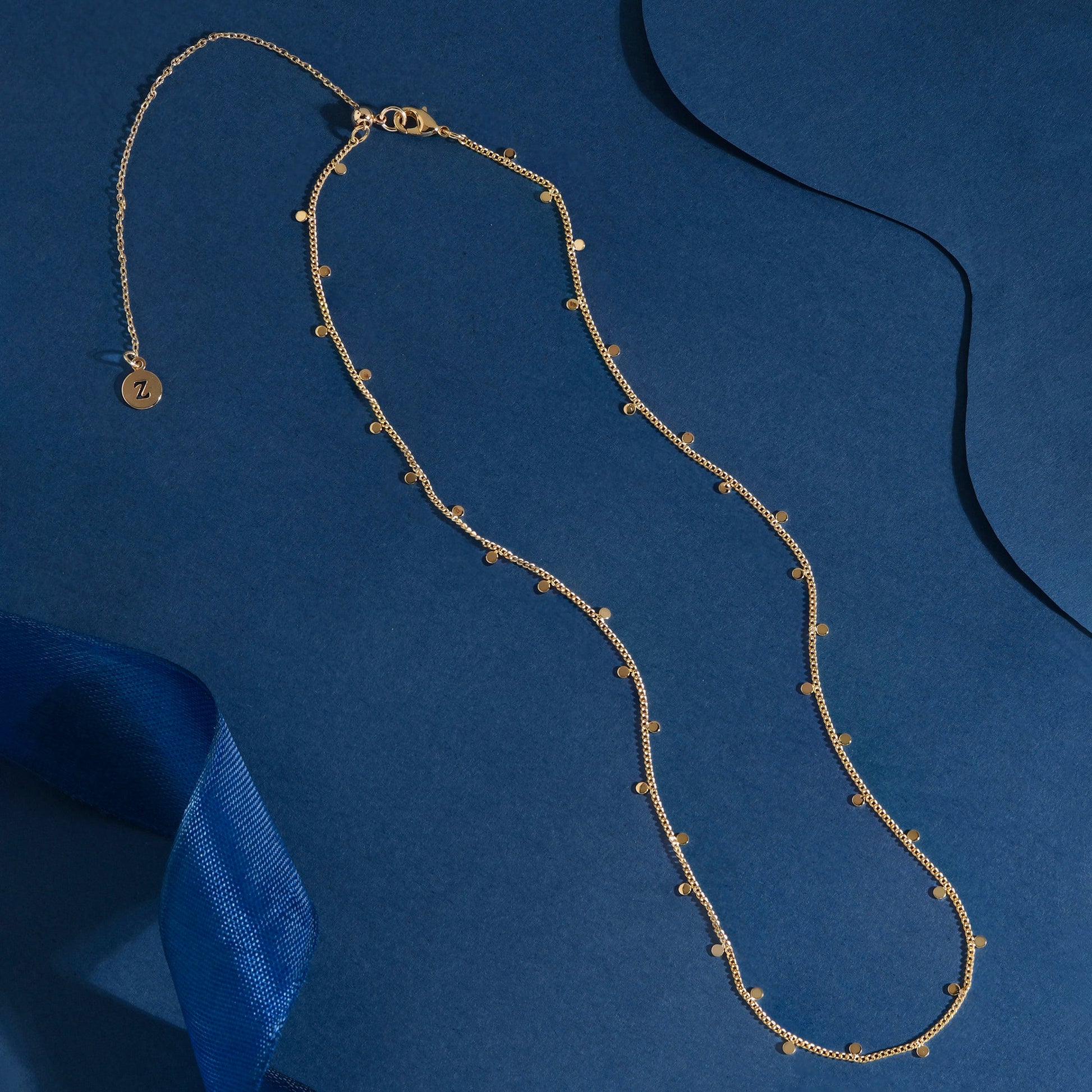"Part of the Z by Silk And Gleam collection. A lovely layer in your simple stack, this necklace features teeny tiny stationed discs that hang on a fine chain. Fastens with a lobster clasp and extender. Plated in 14 carat gold for a luxe, longer-lasting finish."
