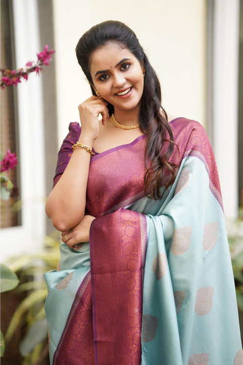 Magnetic Sky Soft Silk Saree With Felicitous Blouse Piece
