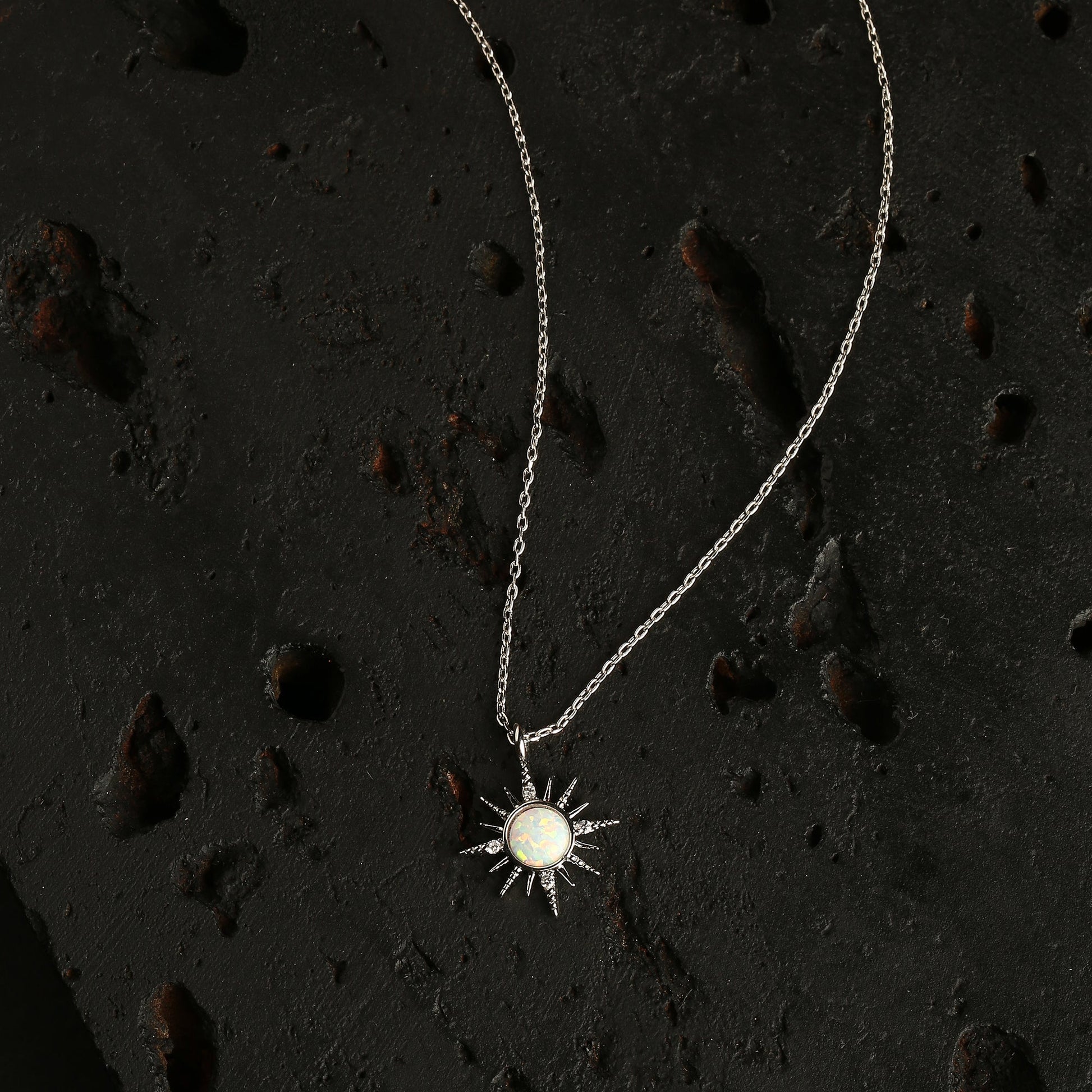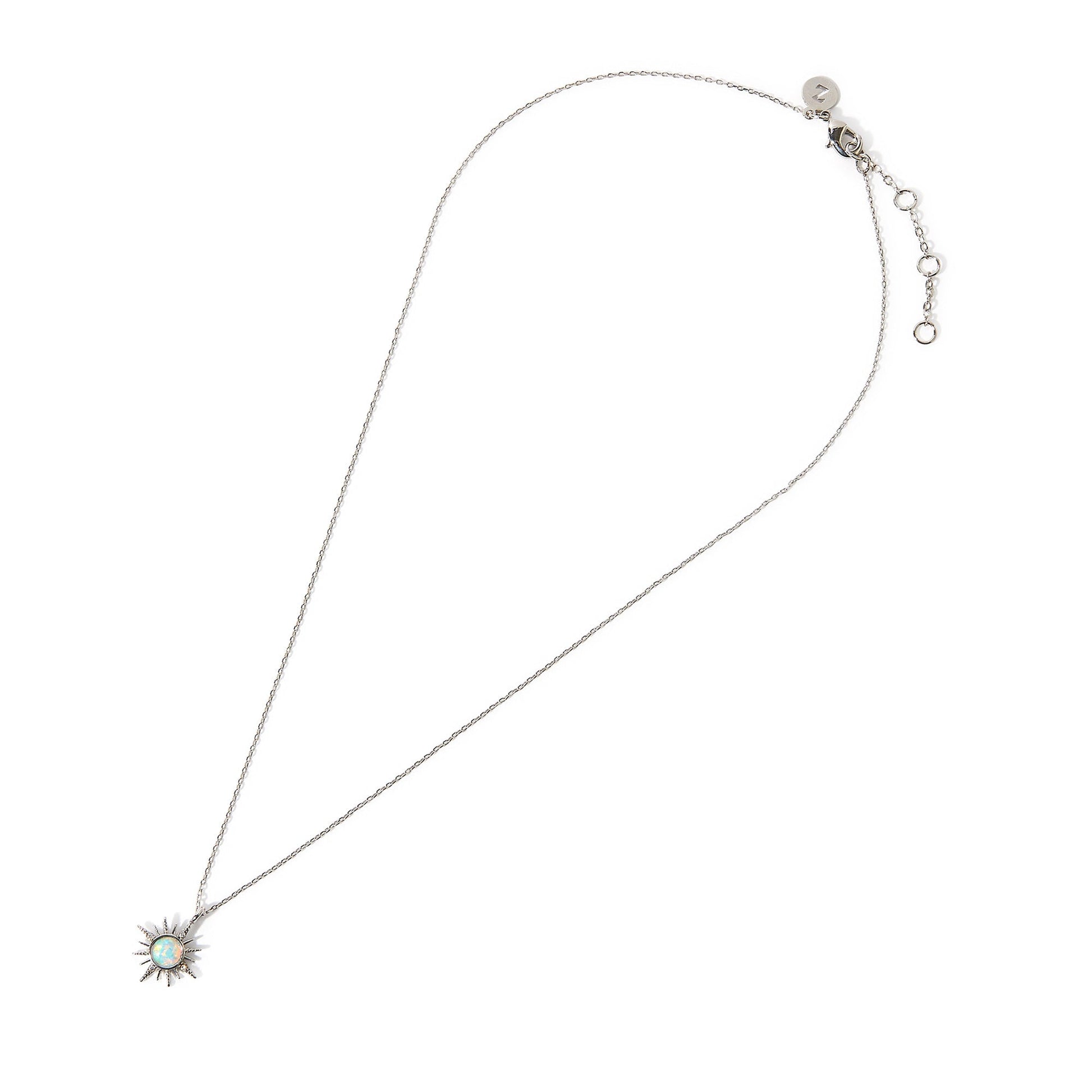 Part of the Z by Silk And Gleam collection. Exploding with supernova levels of sparkle, this necklace is the perfect standalone piece. Crafted in platinum-plated metal, the star is embedded with a pretty opal stone.