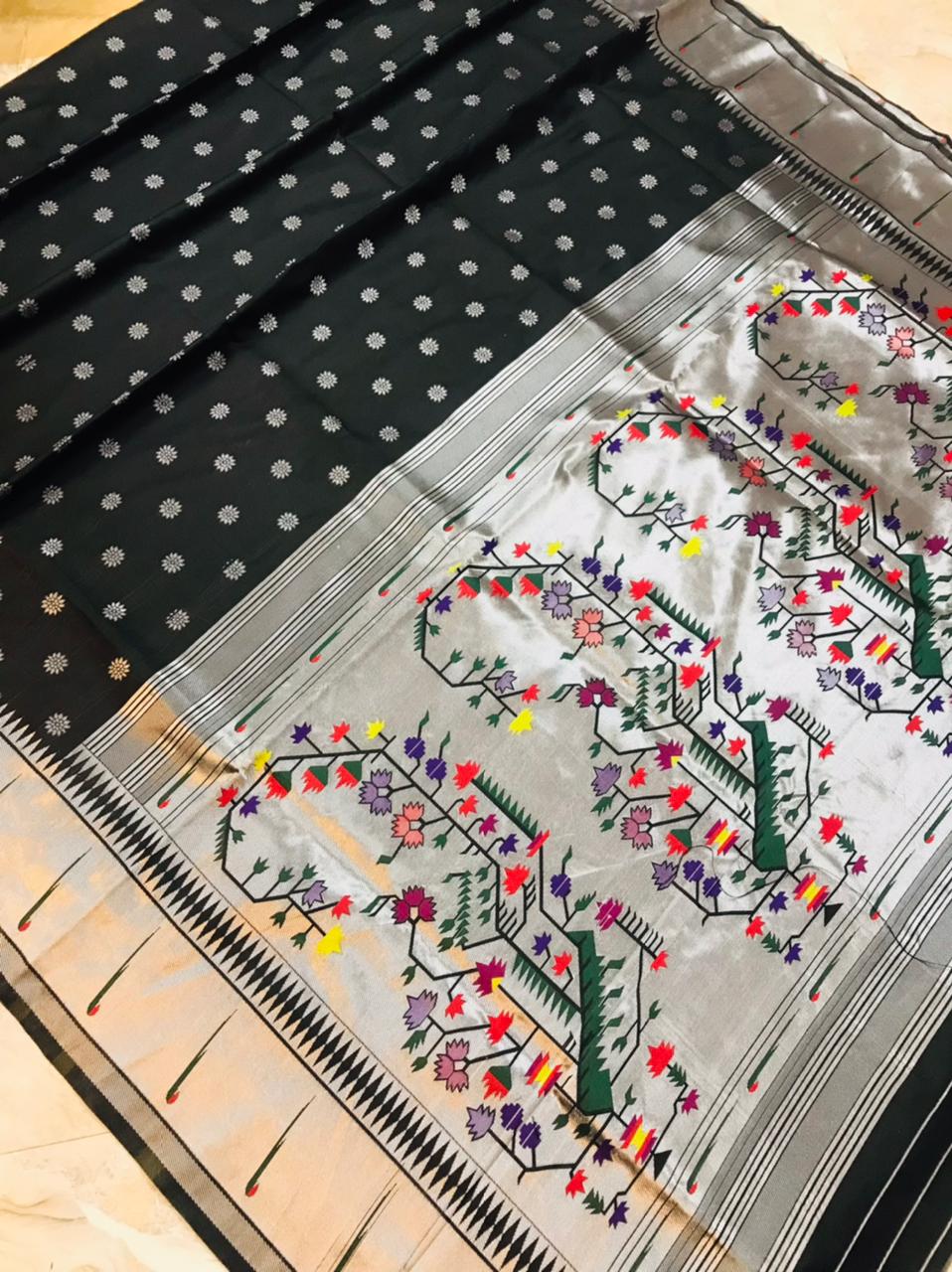 Precious Black Paithani Silk Saree With Magnetic Blouse Piece