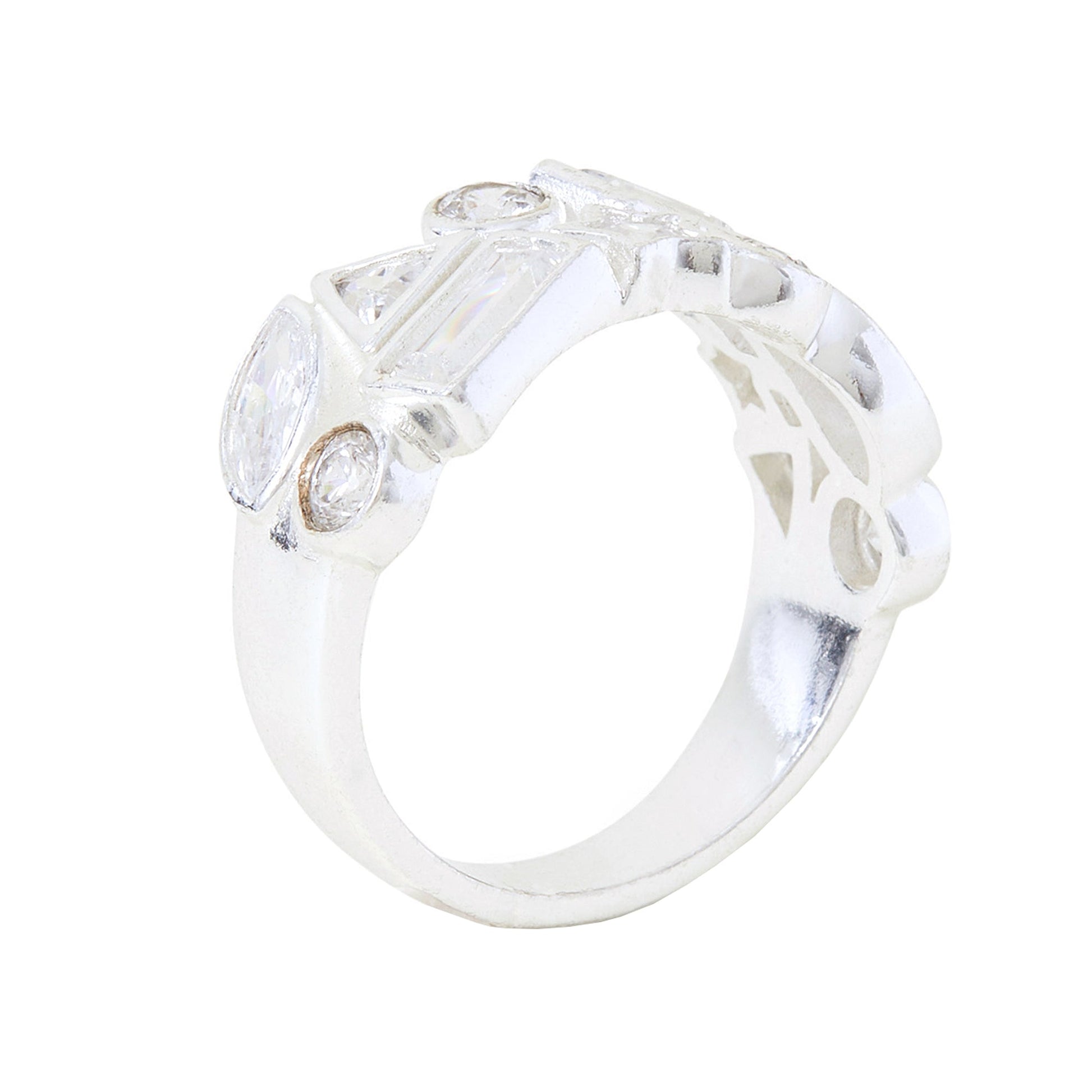 A sparkling statement: Designed with sterling silver, this ring in encrusted with a collection of dazzling gems on a thick band. White