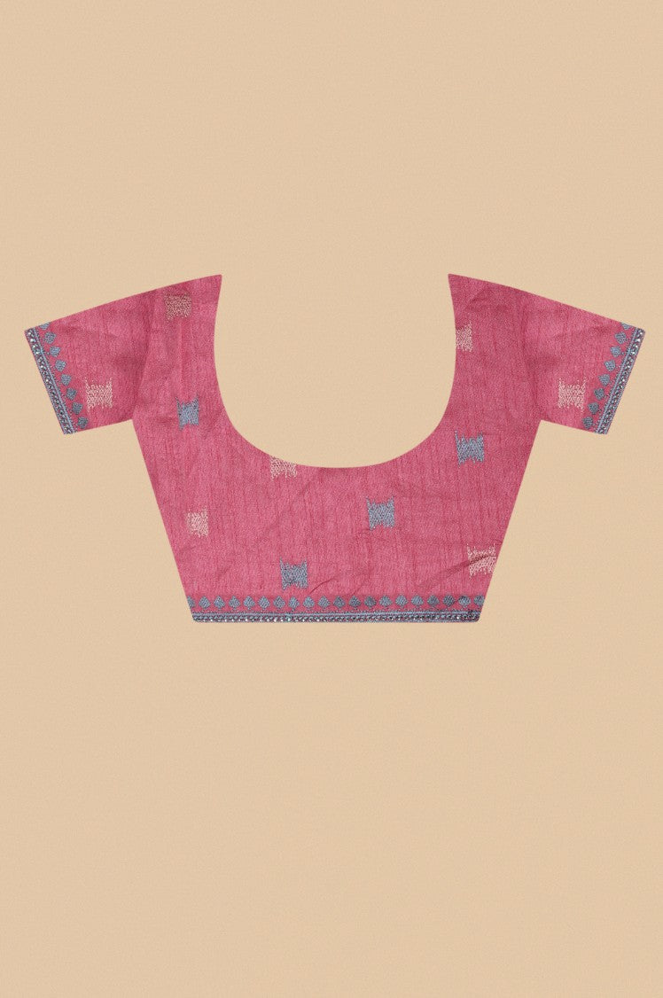 Be festive ready wearing bluish grey color geometric motif woven saree having broad border and palla work paired with blouse having elbow length sleeves